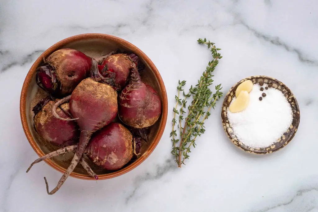 Пакуйте свеклу,тимьяна, чеснока и перца горошком в литровой банке с широким горлышком или в 2 (1-пинтовых) банках, оставляя по крайней мере от 1 до 1 1/2 дюйма свободного пространства для веса.