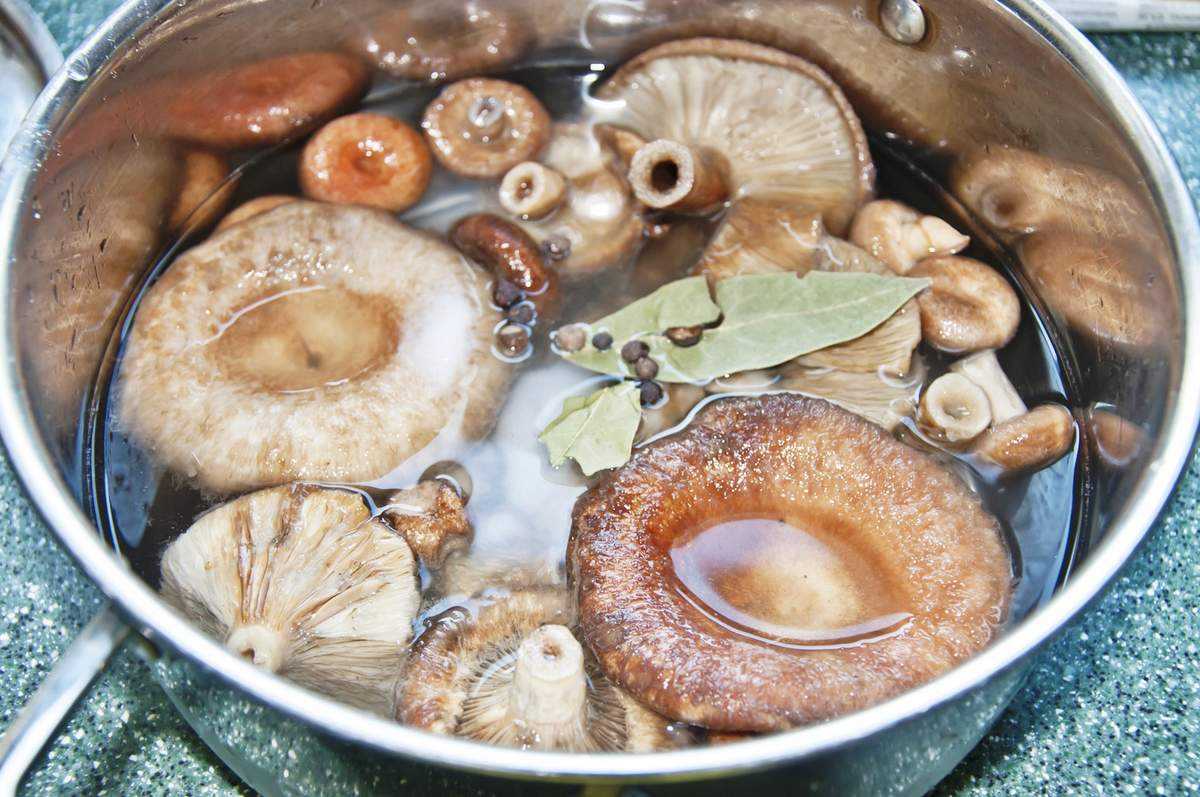 - В кипящую воду опустить сначала листья смородины, а потом подготовленные растения. Грибы варятся примерно 15 минут, но нужно следить, чтобы растение не переварилась;