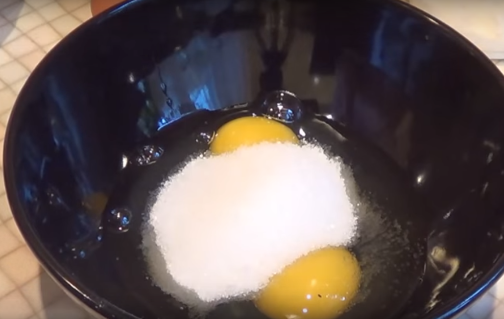 Теперь займёмся яйцами — отделяем желтки от белков и перетираем их с сахаром в однородную смесь. За белки возьмёмся чуть позднее.