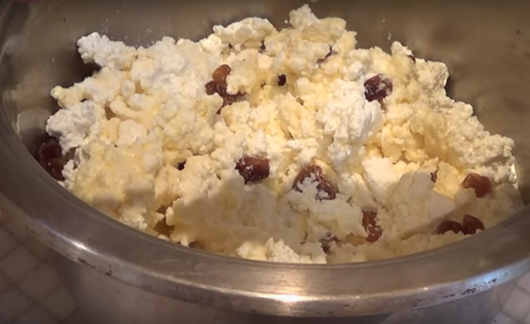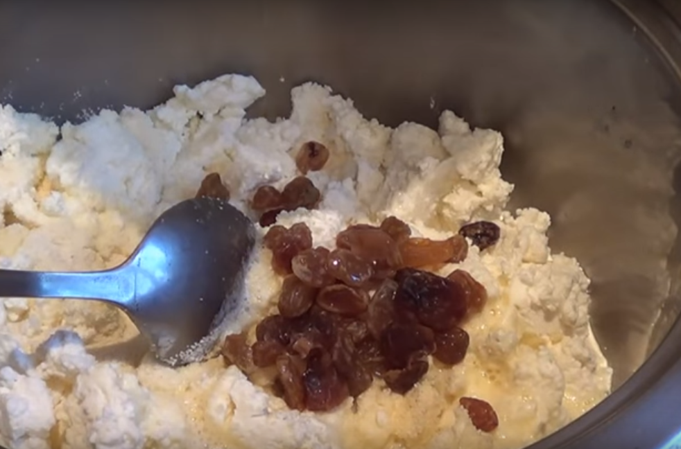 4. При желании в творожное тесто добавляем промытый, а затем обсушенный изюм. Хорошенько размешиваем. Если в тесто добавлялась сухая манка, то оставляем нашу смесь постоять минут 20, чтобы манка набухла.