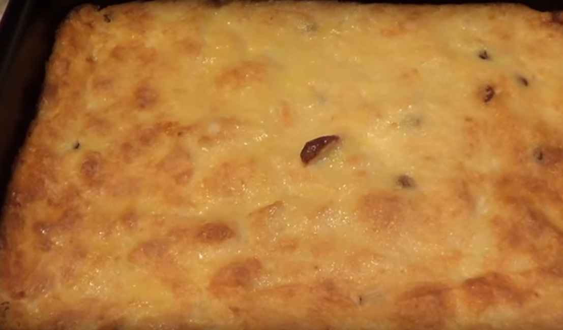 Детсадовский вариант приготовления пышной запеканки с изюмом и подливкой