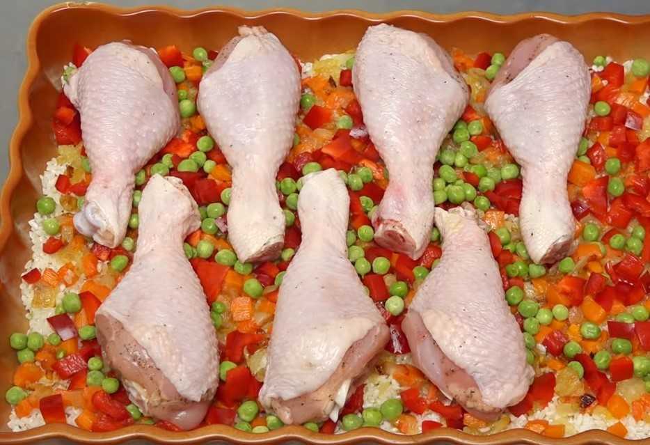 8. Сверху на овощи кладем куриное мясо и заливаем все горячей водой, из расчета: 1 к 2. Если берете два стакана риса, значит воды должно быть 4 стакана.