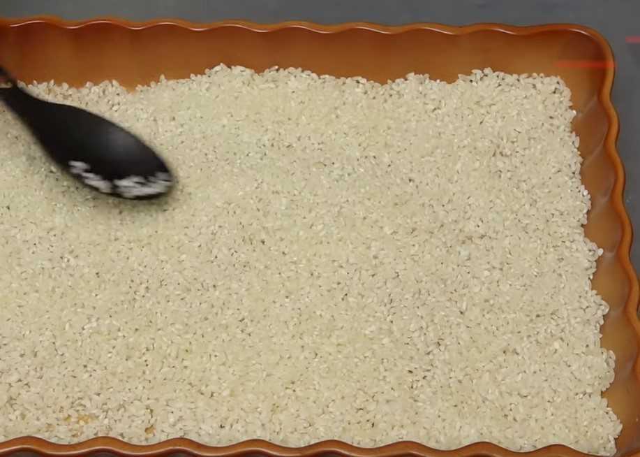 6. Форму для запекания смажем маслом и ровным слоем выложим помытый и подсохший рис.