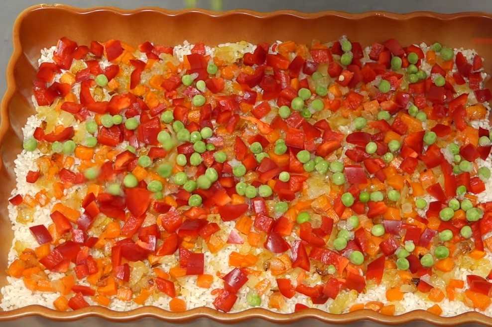 7. На рис выкладываем обжарку из репчатого лука и моркови, порезанный болгарский перец. Добавляем зеленый горошек, можно использовать замороженный. Самое время все посолить, поперчить и добавить специи, любые. Можно и без специй обойтись.