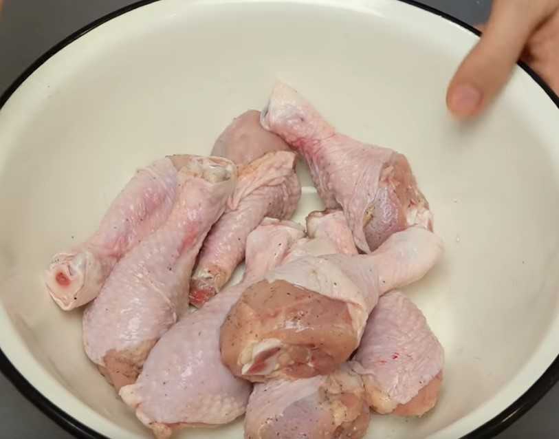 1. Куриные голени моем, обсушиваем, натираем солью и перцем. Если желаете, можете добавить любые специи. Можно использовать любые части курочки.
