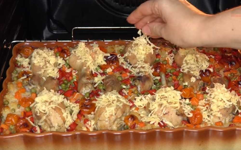 10. Через час форму достаем и каждый кусочек курицы посыпаем тертым сыром. Отправляем снова в духовку, запекаться до получения красивой золотистой корочки.