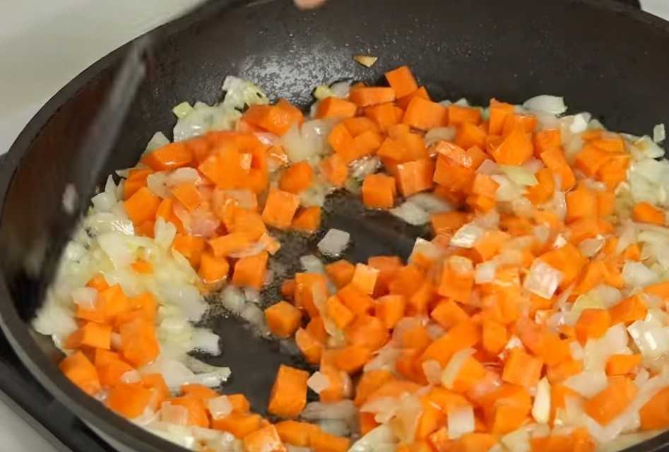 5. Обжарим до прозрачности репчатый лук, добавим к нему морковь и пожарим все вместе до готовности моркови.