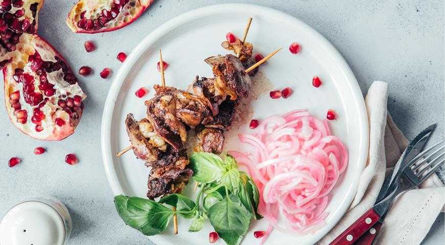 Шашлык из куриной печёнки готовится очень быстро. Причем как из печёнки птицы, так и из бараньей или говяжьей. Здесь используется приём обертывания куска в ломтик бараньего курдючного жира – шашлык получается нежнейший и ароматный.