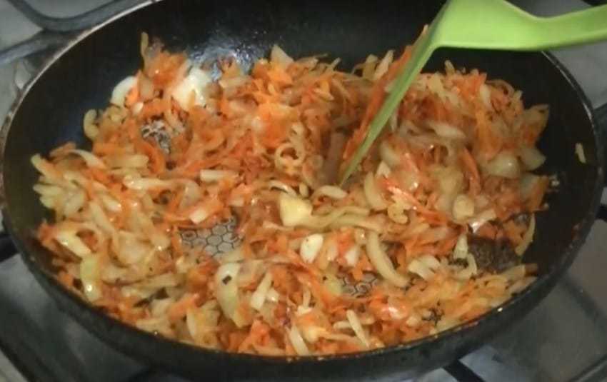 1. Натрите морковь на крупной терке, лук нашинкуйте полукольцами. Отправьте овощи на разогретую сковородку с растительным маслом. Обжаривайте до мягкости.