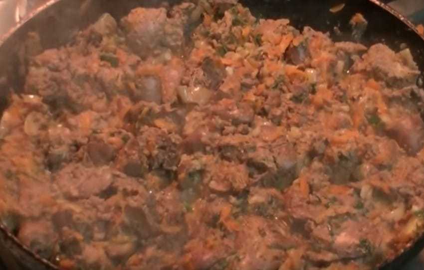 2. Субпродукт моется и режется пополам. Не стоит сильно измельчать ее, иначе она пережарится, будет сухой и жесткой. Обжаривать следует около 7 минут под закрытой крышкой. И не нужно забывать о регулярном помешивании.