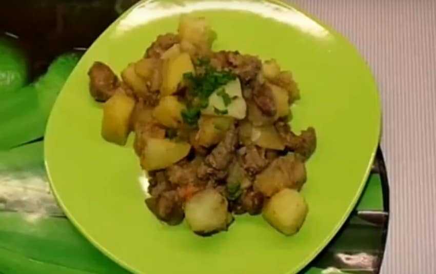 К этому блюду вам уже не нужно будет придумывать гарнир. Субпродукт тушится сразу с картошкой. Получается сытно и вкусно, картофель пропитывается соком и буквально тает во рту.