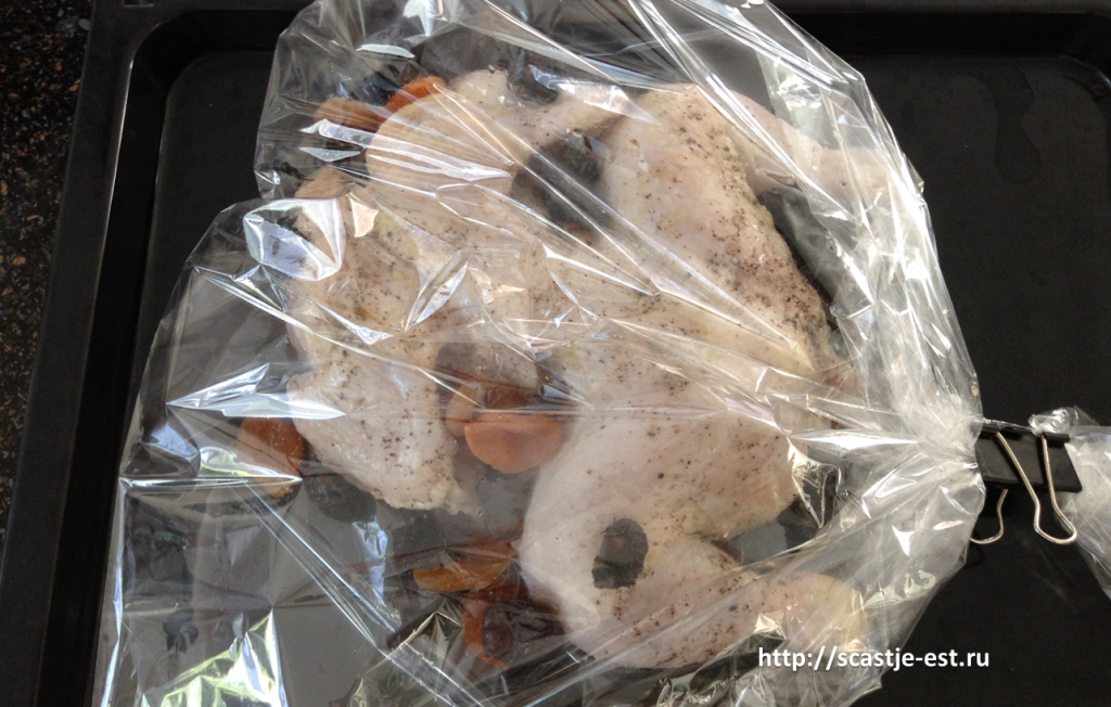 Подготовленные бедра нужно переложить в пакет или рукав для запекания. Рукав от пакета отличается тем, что он идет длинным полотном, от которого нужно отрезать необходимое количество и закрепить оба конца специальными клипсами либо лентами из того же материала, что и сам рукав. Пакет же запаян с одной стороны, остается в него все уложить и завязать второй край.