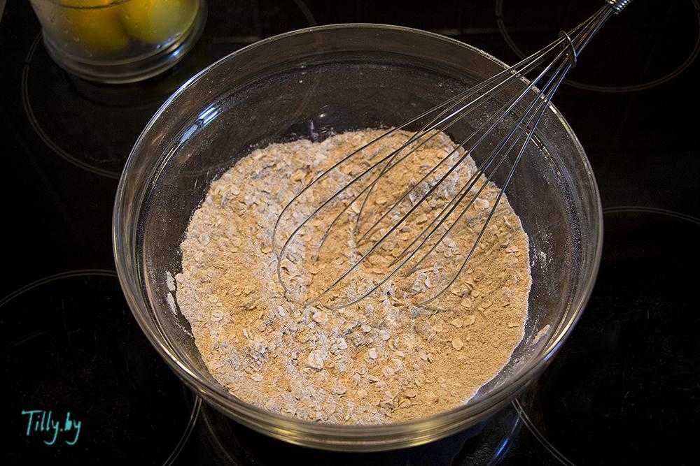 Соединяем сухие ингредиенты: муку+овсяные хлопья+ соль+разрыхлитель теста.