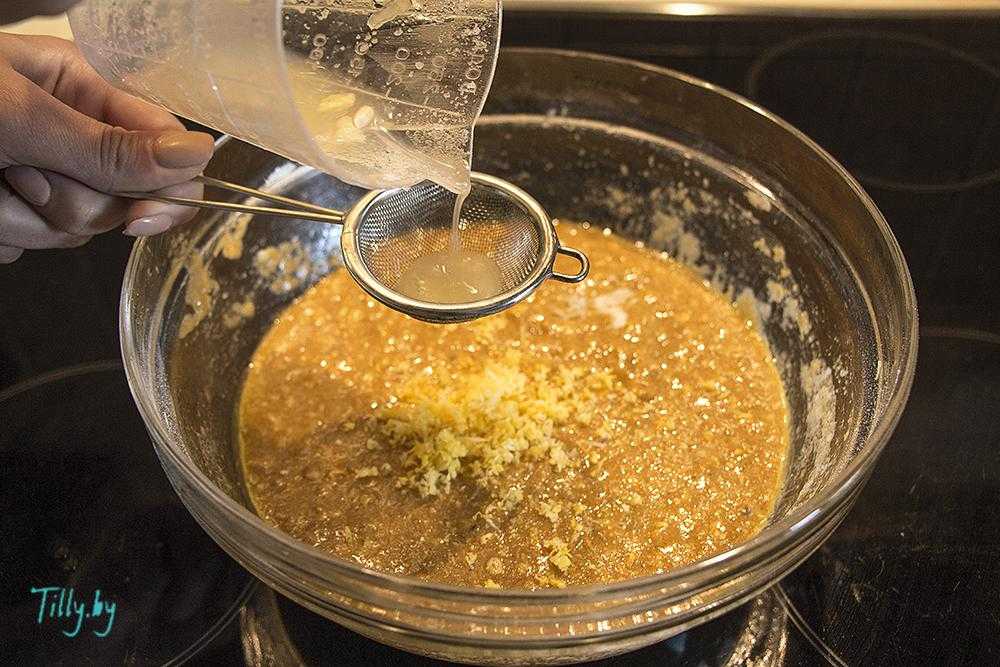 Добавим цедру, и вольем сок лимона через ситечко в тесто, чтобы не попали косточки.