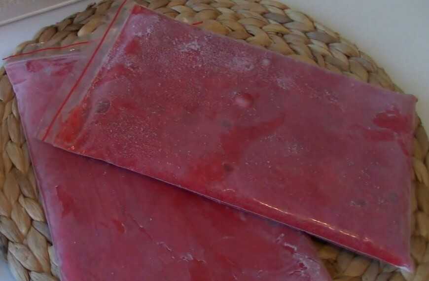 Много в один пакет не наливаем — толщина ягодного слоя должна быть 1,5-2 сантиметра. Выпускаем из пакета воздух и плотно закрываем застежку.