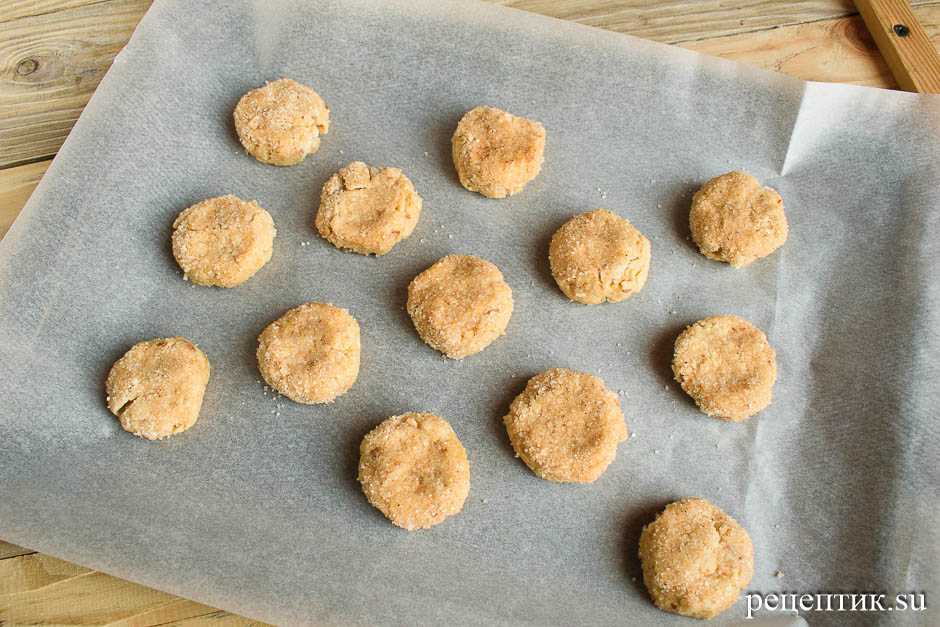 Имейте в виду, что масса плохо раскатывается и формируется, поэтому можно либо скатывать шарики, либо выкладывать тесто на противень ложкой. Используйте пекарскую бумагу или термостойкий коврик для выпечки. Масла в тесте нет, и печенье может пригорать и прилипать.