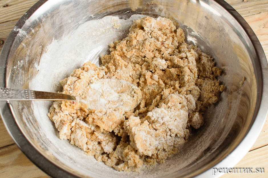- Добавьте сахар, мед, ванилин, немного пряностей. Хорошо перемешайте. Затем соедините с овсяными хлопьями и руками разотрите продукты. У вас должна получиться почти однородная смесь.