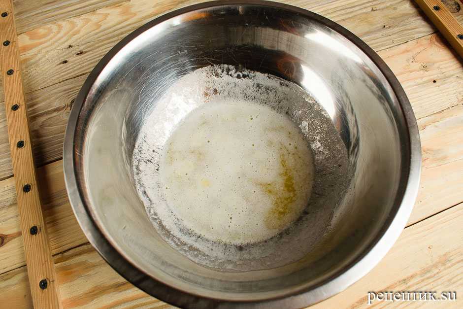 - Подогрейте кефир. Добавьте соль и соду. Хорошо перемешайте. Перелейте напиток к остальным продуктам.