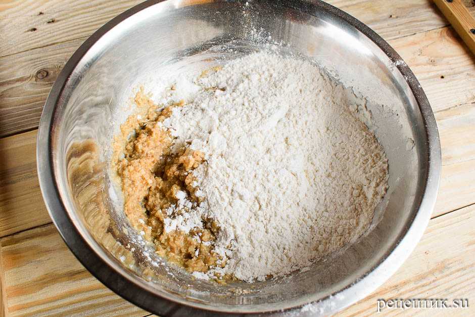 - Насыпьте необходимое количество пшеничной муки. Замесите руками крепкое тесто. Не добавляйте слишком много муки, иначе тесто будет густым.