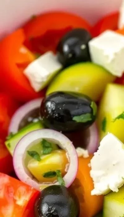 Греческий салат с фетой – это настоящий символ лета и средиземноморской кухни! Простота приготовления, свежесть ингредиентов и неповторимый вкус делают его одним из самых популярных салатов в мире. Сочные помидоры, хрустящие огурцы, сладкий перец, красный лук, маслины каламата и, конечно же, солоноватая фета – идеальное сочетание! Заправка из оливкового масла, лимонного сока и орегано завершает эту гастрономическую симфонию.