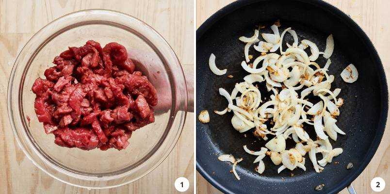 - Вместо фарша можно использовать вырезку говядины, нарезанную на мелкие кубики или соломку. Понадобится обжарить мясо до готовности, затем продолжить приготовление блюда по стандартной инструкции.