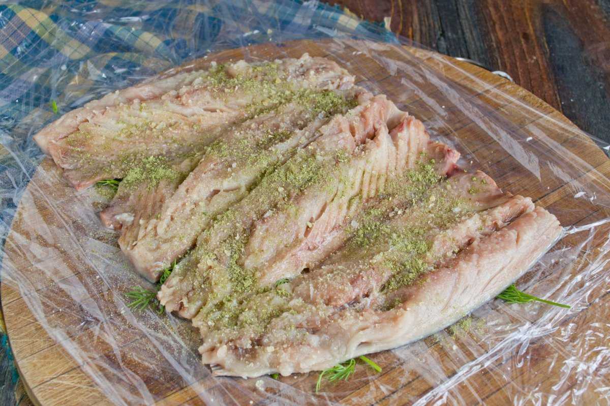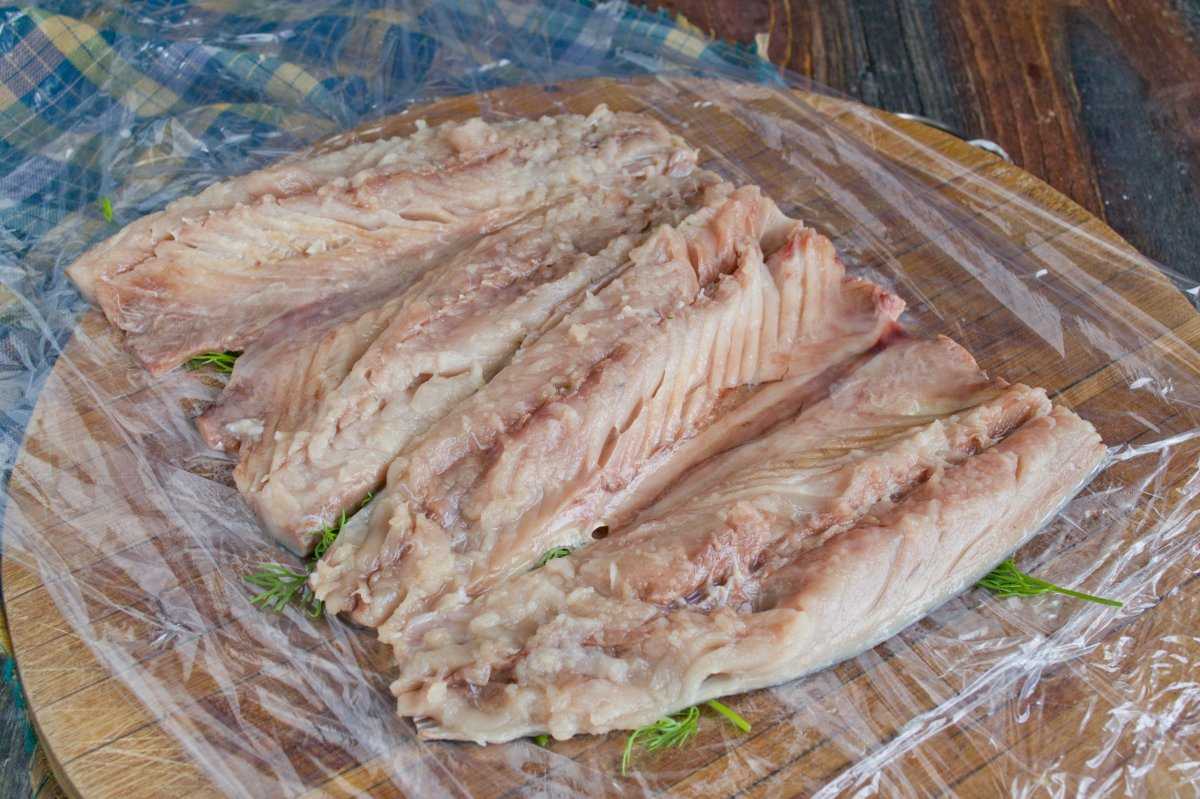 Рыбу размораживаем, отрезаем хвост, голову и плавники. Вдоль хребта надрезаем тушку, разворачиваем, извлекаем внутренности и удаляем хребет. Выдёргиваем пинцетом оставшиеся косточки, промываем филе холодной водой.