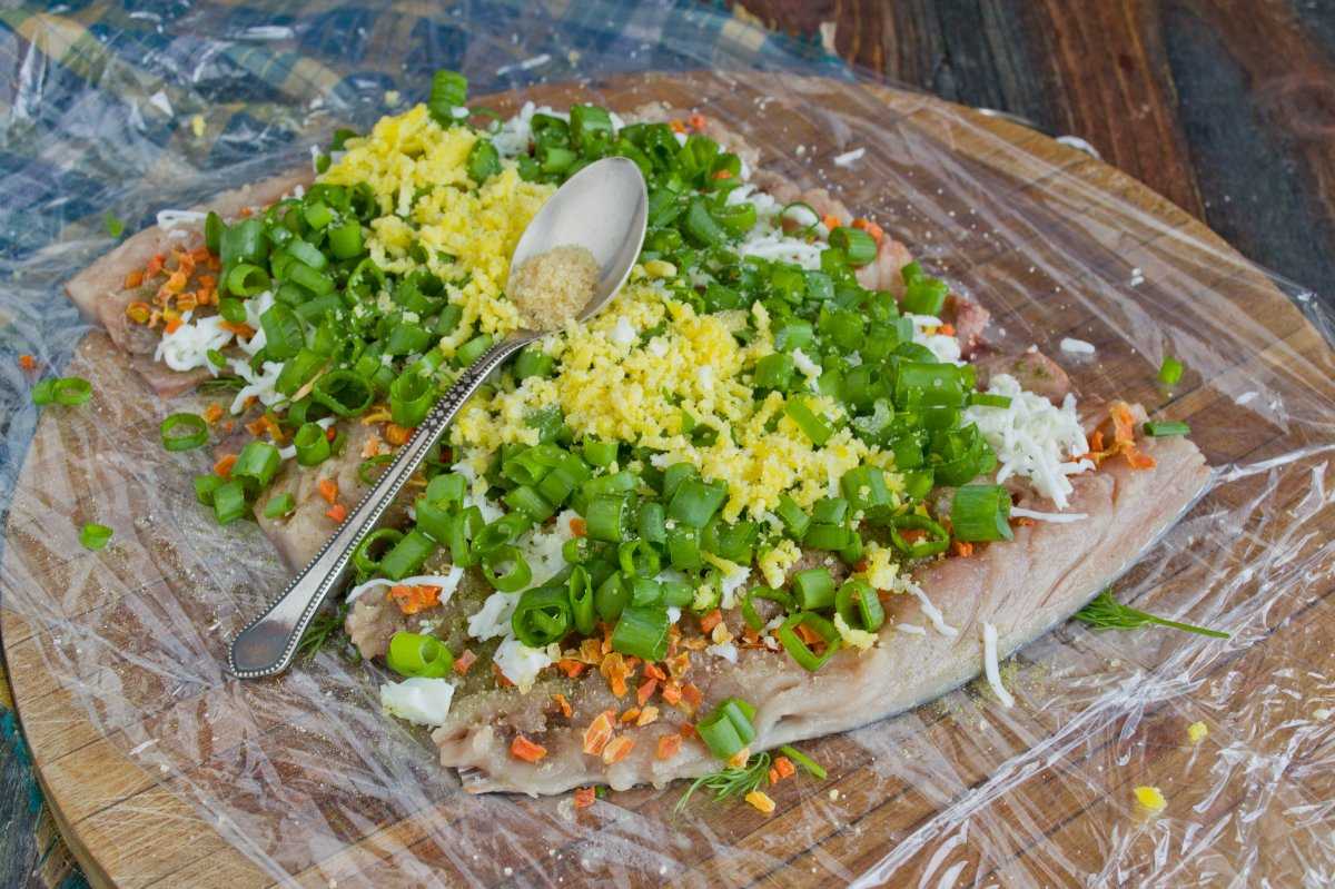 Аккуратно свернуть рыбу с начинкой в тугой рулет.