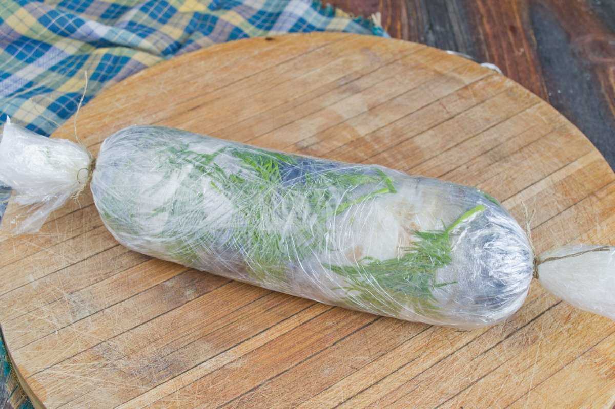 Приподнимаем край плёнки, сворачиваем плотный свёрток, оборачиваем свёрток ещё несколькими слоями пленки. Края перевязываем кулинарным шпагатом или нитью.