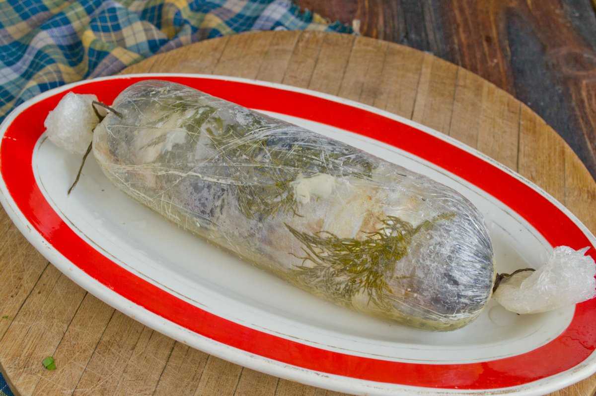 Так как рулет герметично завернут в пленку, он варится в собственном соку. В нем нет никакой студенистой массы, желатин полностью впитывается в рыбу.
