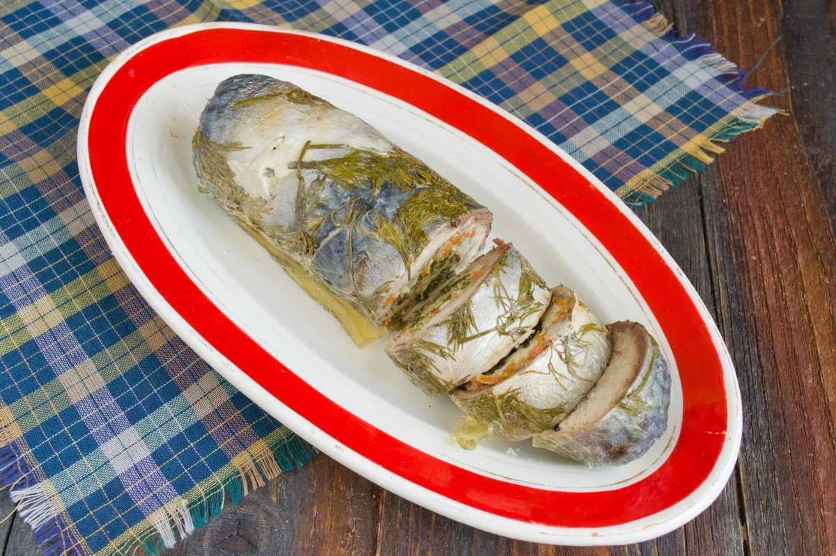 - Рыбу выложить на пищевую пленку. Причем каждую рыбину выложить таким образом, чтобы получилось цельное полотно, нахлестывая края тушки друг на друга. Натирают размоченным желатином. После ее солят, перчат и выкладывают на нее тушеные охлажденные овощи. Сверху укладывают и разравнивают остатки желатина. Рыбу скручивают в тугой рулет, плотно завязывают пленку. Затем рыбу аккуратно погружают целиком в кипящую воду и варят 10-15 минут. После закуску охлаждают и нарезают на тонкие кусочки, украшают зеленью. Такая закуска украсит любой праздничный стол и быстро станет любимым блюдом в семье.