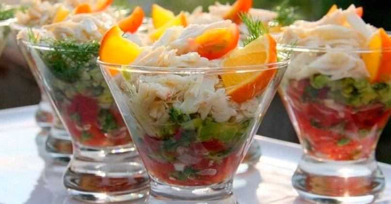 Гораздо удобнее есть салаты, поданные порционно, поэтому советую к праздничному столу приготовить хотя бы один в креманках для каждого гостя. Например, из крабового мяса с апельсинами. Если не удастся купить крабовое мясо, можно обойтись крабовыми палочками.