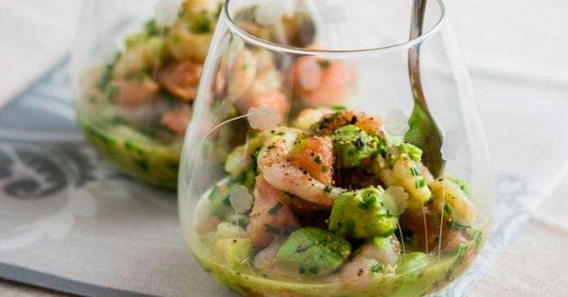 Изумительный и вместе с тем очень простой салат из креветок и авокадо подается или на зеленых листьях, или порционно в креманках. Он замечателен сочетанием обжаренных в масле и белом вине креветок с мягким и нежным авокадо.