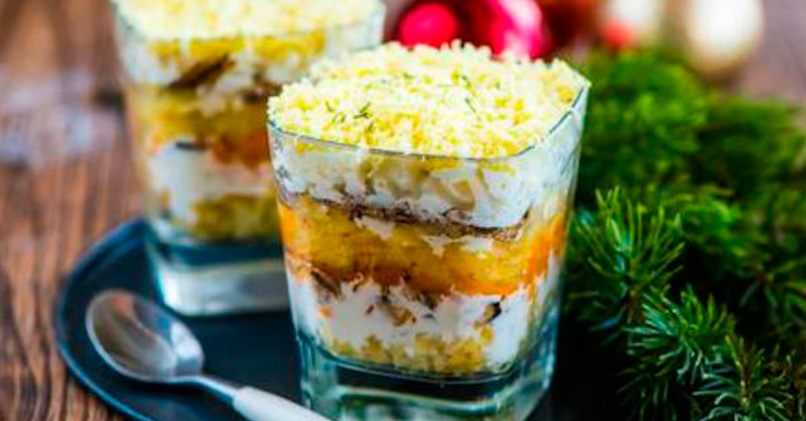 Самый простой, но очень вкусный салат лучше подать порционно. Подготовьте заранее креманки или бокалы с толстым дном, посчитайте, чтобы их хватило всем гостям, и сделайте несколько лишних порций, ведь обязательно кто-нибудь зайдет в праздник без приглашения, да и добавка никому не помешает. Сверху посыпьте яичными желтками или натертым сливочным маслом, пусть желтый цвет расставленных по столу креманок напоминает нам о солнечной весне.