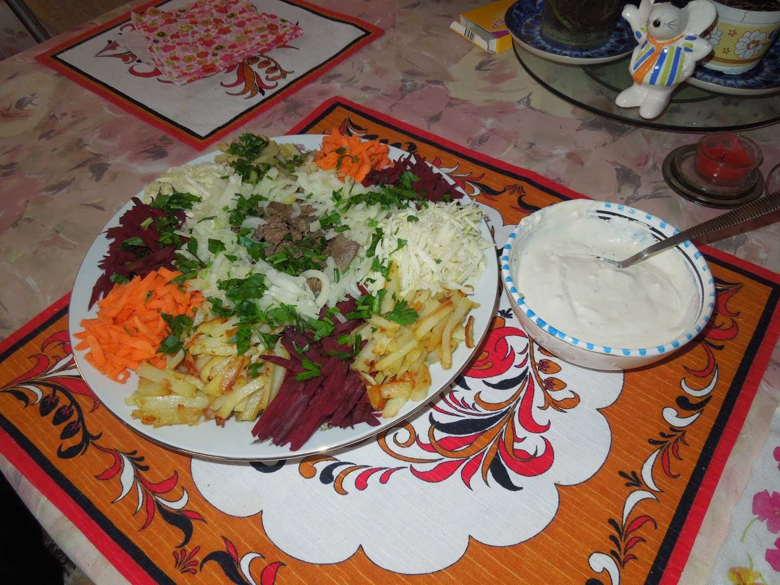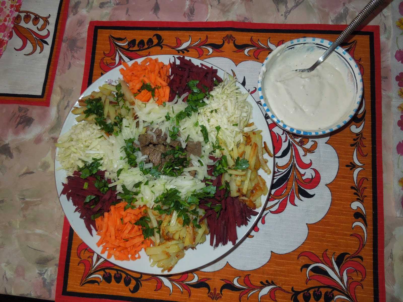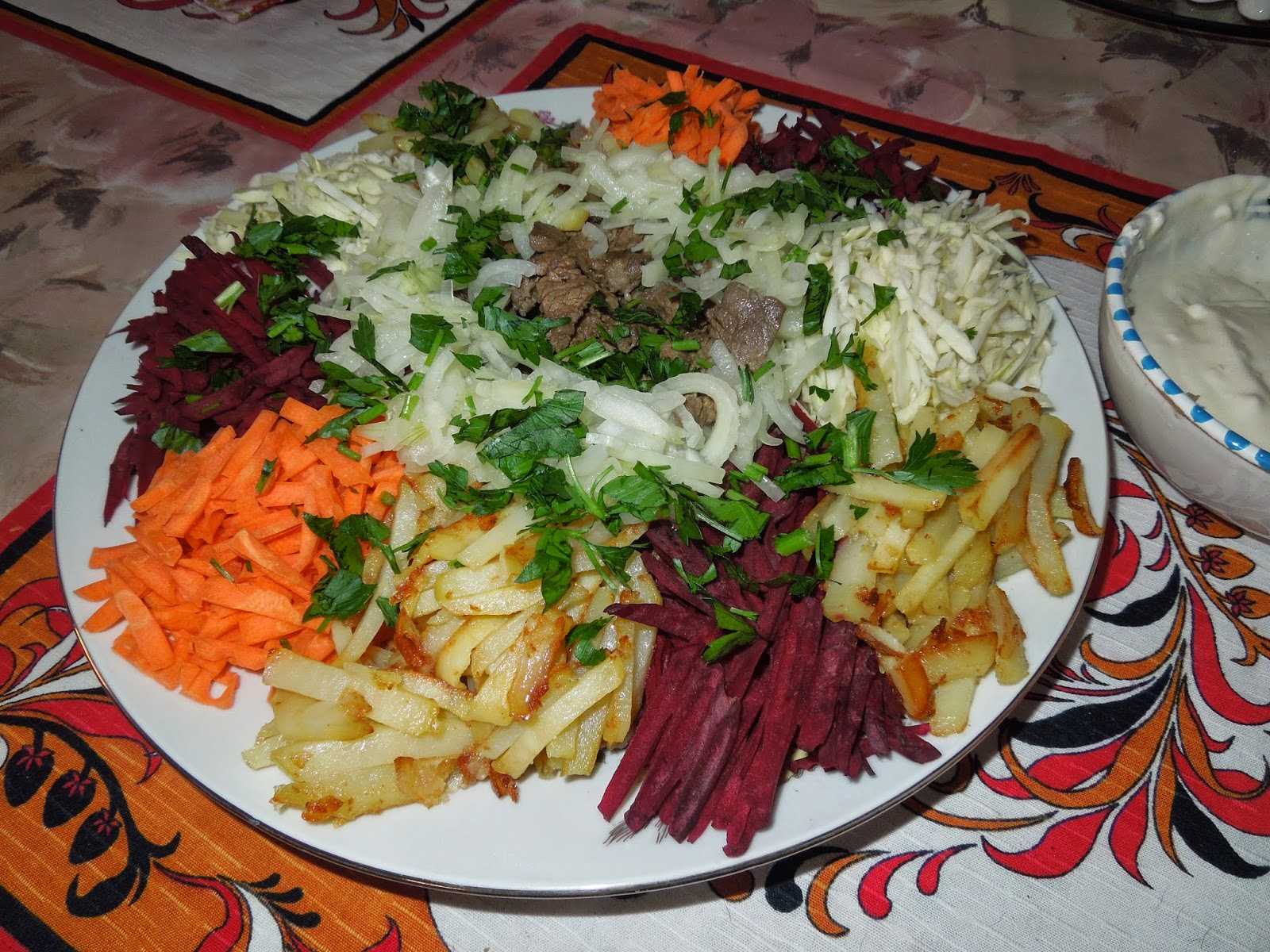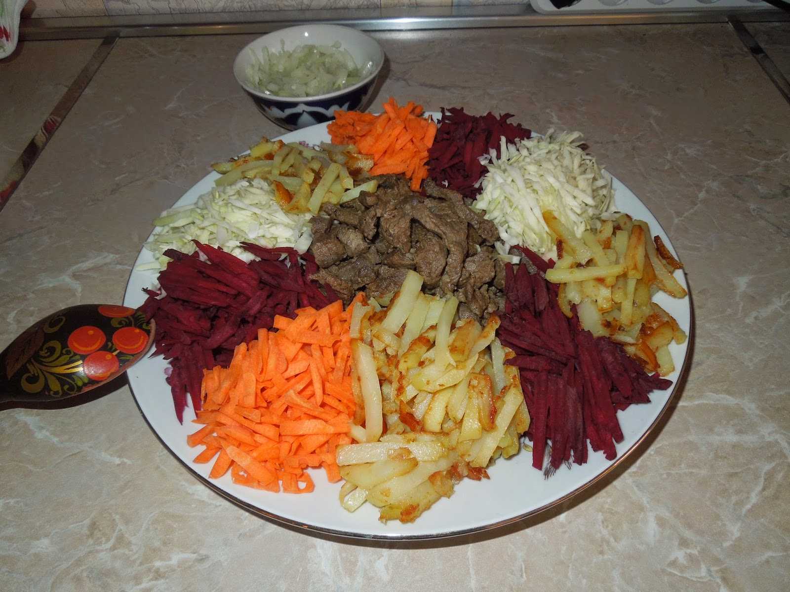 Капусту тонко нашинковать, посолить, слегка перетереть руками. Свеклу и морковь нарезать на терке для корейской моркови. Выложить овощи кучками по краю блюда. Нарезать картошку «спичками», мясо очень тоними брусочками поперек волокон. На одной сковороде в растит масле обжаривать картошку, на другой — лук, затем добавить к нему мясо.Жарить недолго, на среднем огне. В конце жарки и то, и другое посолить, поперчить. Не дать картошке стать совсем мягкой, она должна сохранять форму. Выложить ненадолго на бумажное полотенце картошку, на другое — лук с мясом, затем положить в середину блюда с салатом картошку, сверху — мясо. Перед едой перемешать. Заправка не требуется, достаточно того масла, которое осталось на картошке и мясе, можно только приправить солью и перцем по вкусу и сбрызнуть уксусом или лимонным соком.
