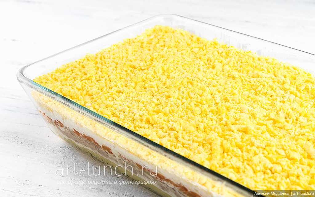 Ну, и в завершении нашего кулинарного спектакля прима, роль которой сыграл яичный желток. Выкладываем поверх всех ингредиентов тёртый желток, равномерно распределяем по всей площади салата. Накрываем форму пищевой плёнкой и убираем в холодильник как минимум на 1 час. Ингредиенты охладятся, познакомятся друг с другом, подружатся и создадут совместный неповторимый вкус.