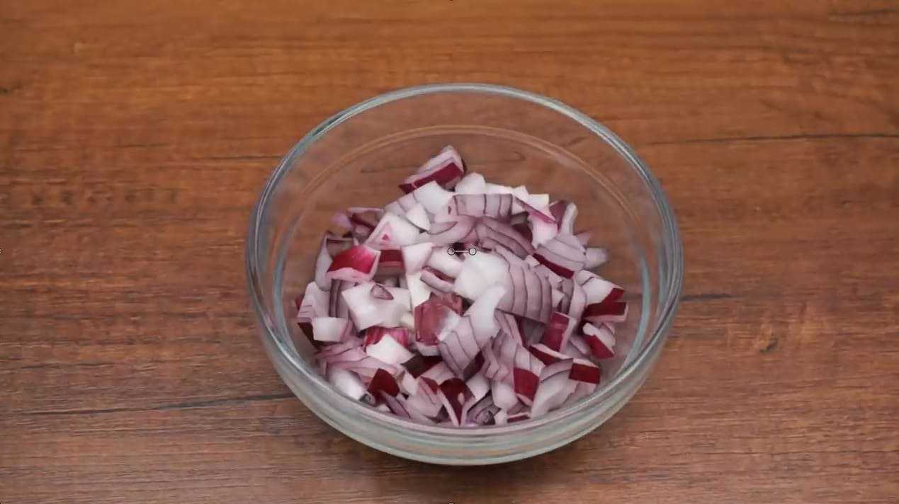 Лук нарежьте полукольцами. Перец очищаем от семян и перепонок и режем соломкой.