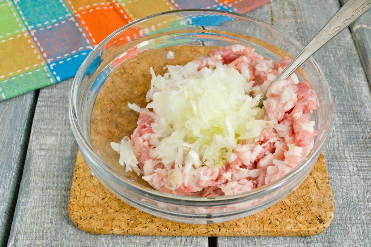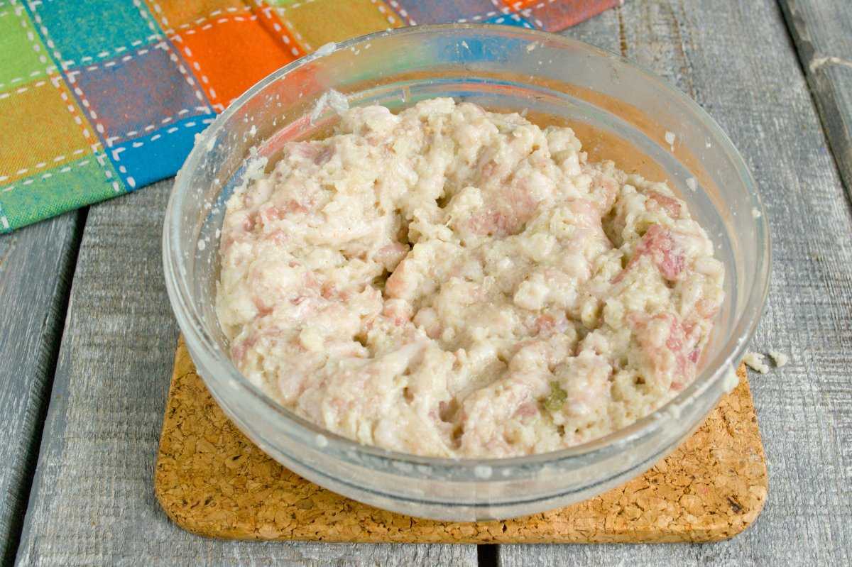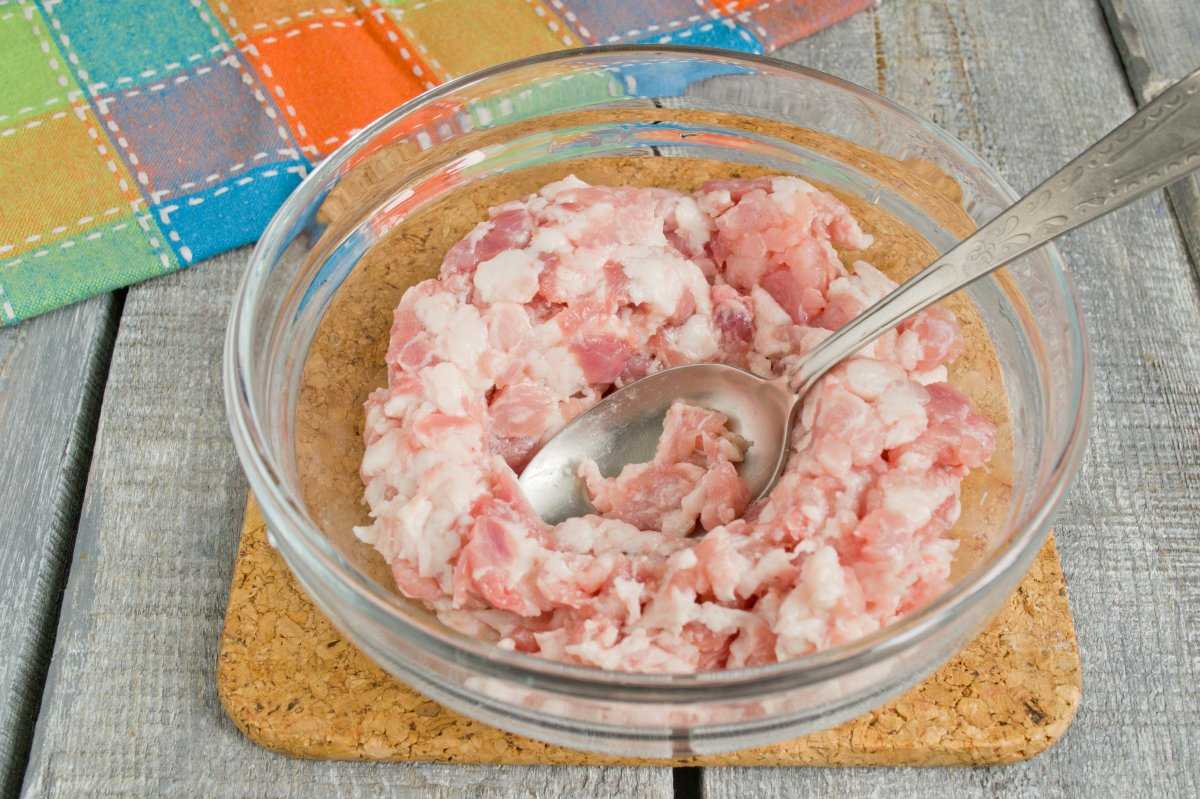 Свинина, лук и чеснок перекручиваются в фарш. Туда же идет молочный батон, вымоченный в молоке. Фарш тщательно перемешивается руками до однородности. Приправляется солью. Также в фарш из свинины необходимо добавить желток куриного яйца.