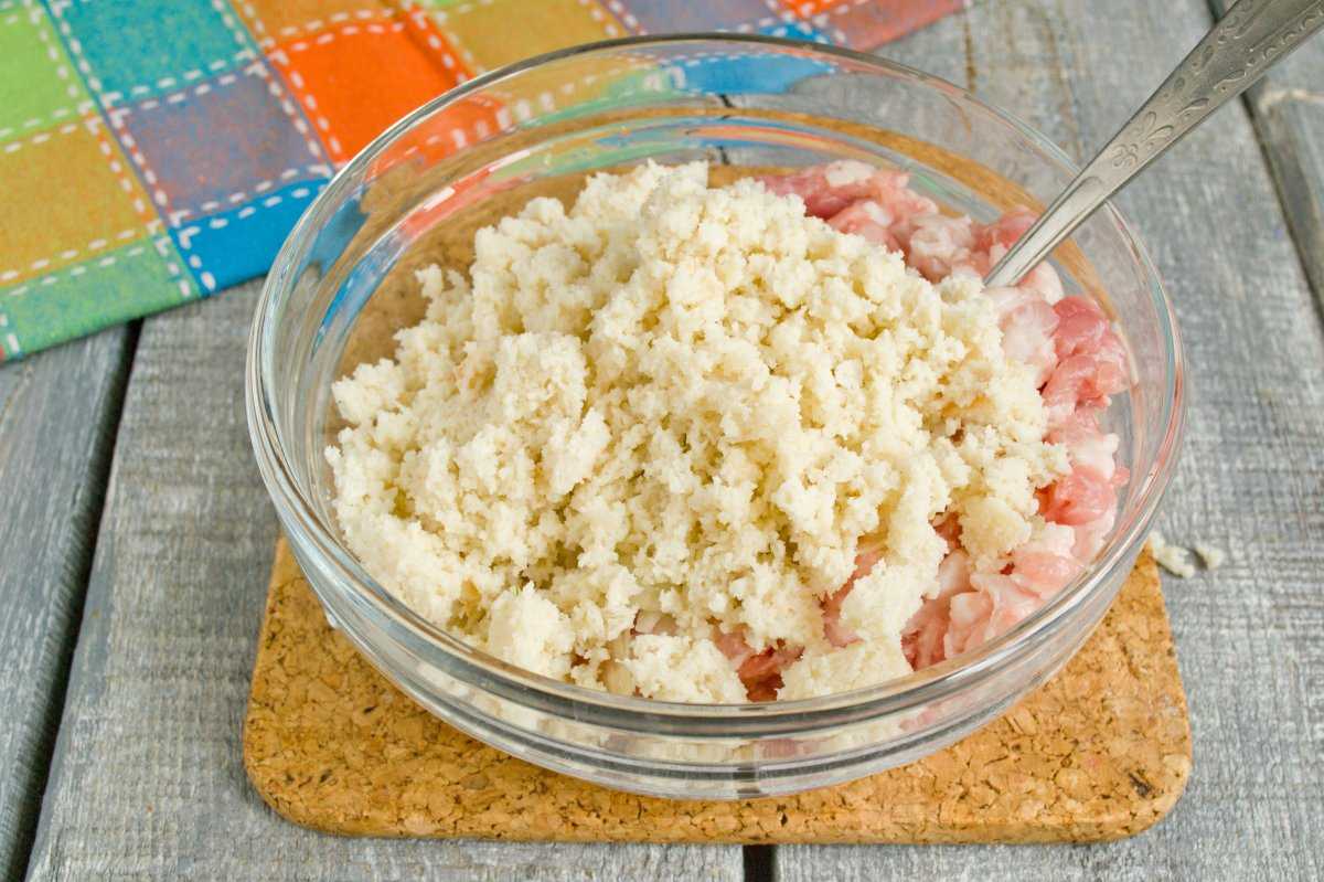 С черствого белого хлеба срезаем корку, мякиш размачиваем в половине холодного молока. Руками разминаем хлеб, чтоб получилась мелкая крошка. Добавляем размоченный мякиш к мясу и луку.
