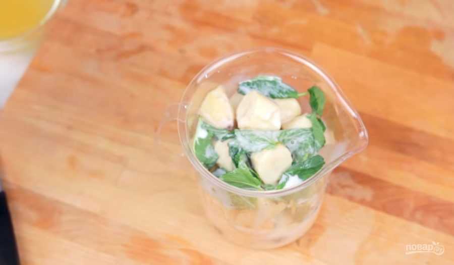 - В первую очередь для измельчения лучше выкладывать в чашу свежую зелень, чтобы остальные компоненты прижали легкие листья. Если шпинат высыпать последним, придется прижимать его руками для уплотнения.