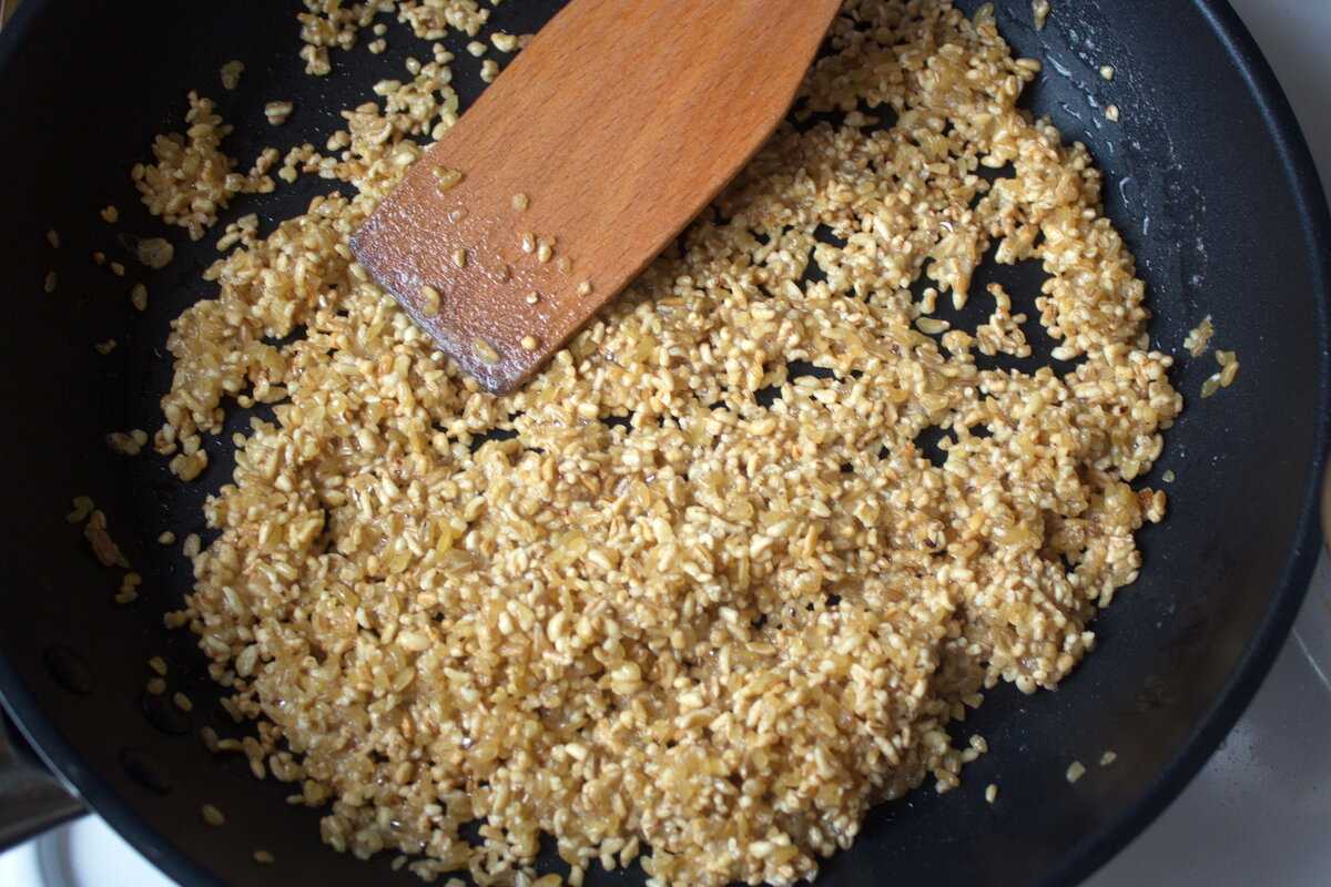 Обжарим булгур со специями до появления лёгкого хлебного аромата и аромата специй. Помешивайте, чтобы не пригорел!