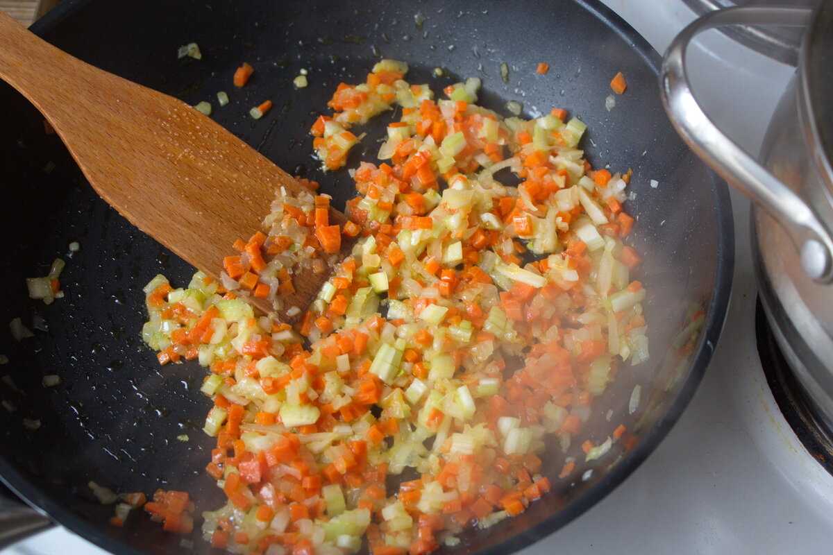 В сковороде разогрейте подсолнечное масло и обжарьте лук с морковью, помешивая, около 3-4 минут.