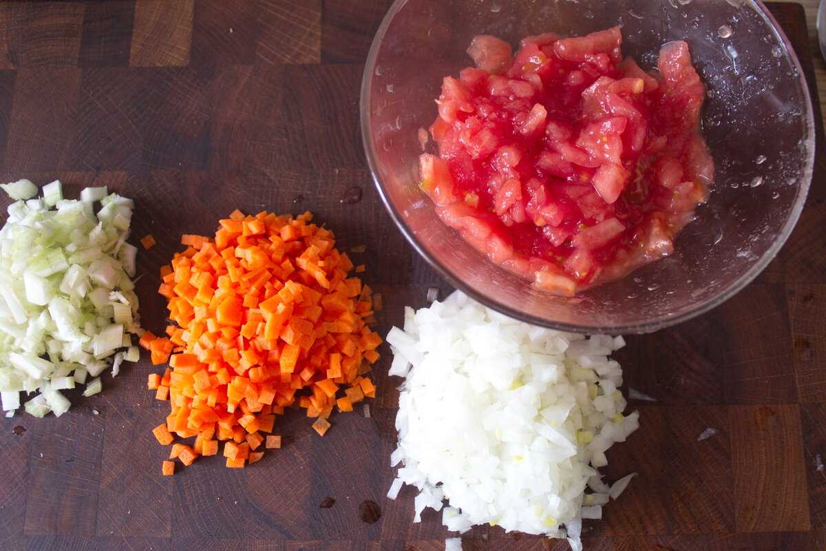 Морковь очистите. Нарежьте морковь и вторую половину луковицы маленькими кубиками.