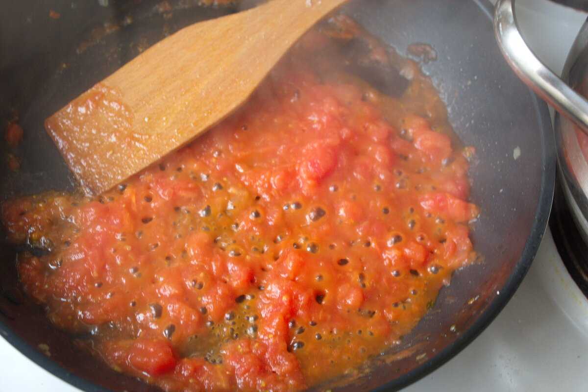 Затем добавьте томатную пасту, влейте немного картофельного отвара из кастрюли (3-4 ст. ложки) и продолжите обжаривать ещё пару минут.