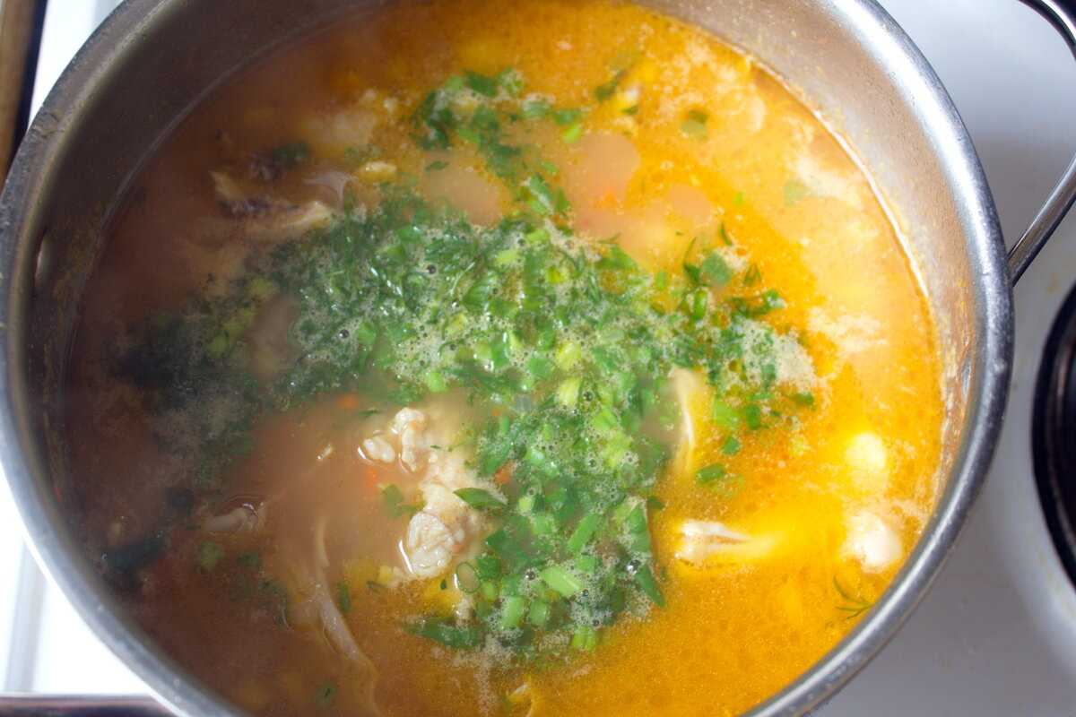 В конце варки можно добавить в кастрюлю немного измельченной зелени. Готовый суп снимите с огня и дайте минут 5-10 постоять под крышкой.