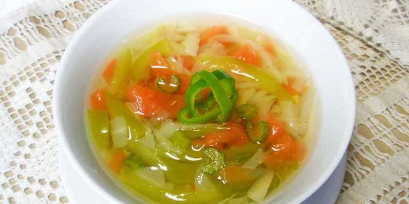 Сначала нужно нарезать сельдерей ломтиками, поместить его в кипящую воду (около литра). Перец режется более крупно, брокколи делятся на мелкие соцветия, и все это добавляется в воду. Затем туда же добавляем нарезанный полукольцами лук. Огонь сделайте минимальным. Помидоры очистите от кожуры, нарежьте небольшими кусочками. Вместе с чесноком, предварительно разбавленным, поместите их в бульон. Суп кипятите еще в течение трех минут. Добавьте соль и перец. Выключите огонь и дайте супчику потомиться еще в течение 15 минут.