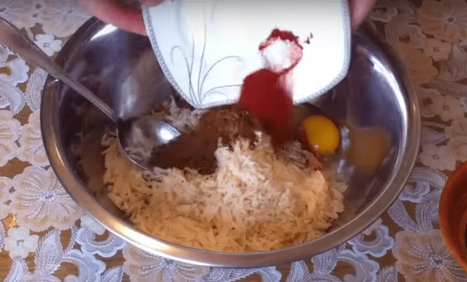 Добавляем к ранее измельченным ингредиентам заранее отваренный рис. Добавляем в миску с ингредиентами одно куриное яйцо и соль по вкусу. Вымешиваем ингредиенты до состояния однородной массы.