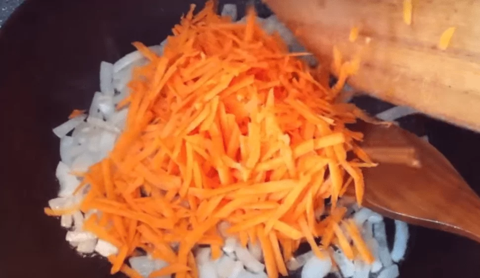 Для этого сначала пассеруем измельчённые полукольцами и соломкой лук и морковь на сковороде с маслом, чтобы они стали мягкими.