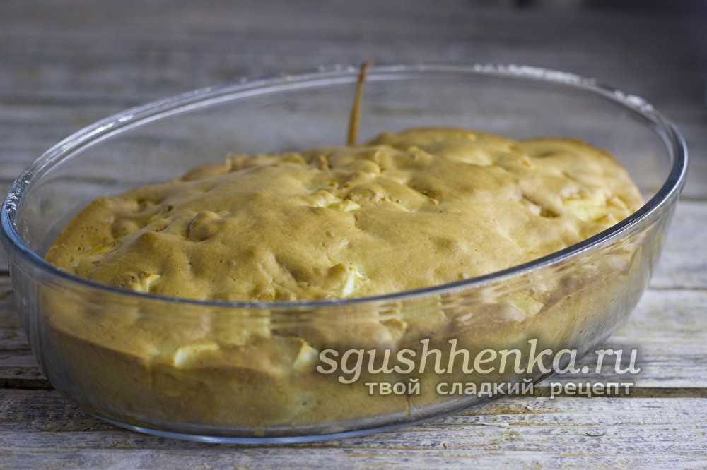 Бисквитную шарлотку проверяйте на готовность очищенной от серы спичкой или зубочисткой. Проткните готовый корж и проверьте деревянную палочку. Сухая поверхность сигнализирует о готовности. Влажная древесина свидетельствует о том, что выпечка не готова. Готовый пирог посыпайте сахарной пудрой, смажьте сгущенным молоком, украсьте белковым кремом.