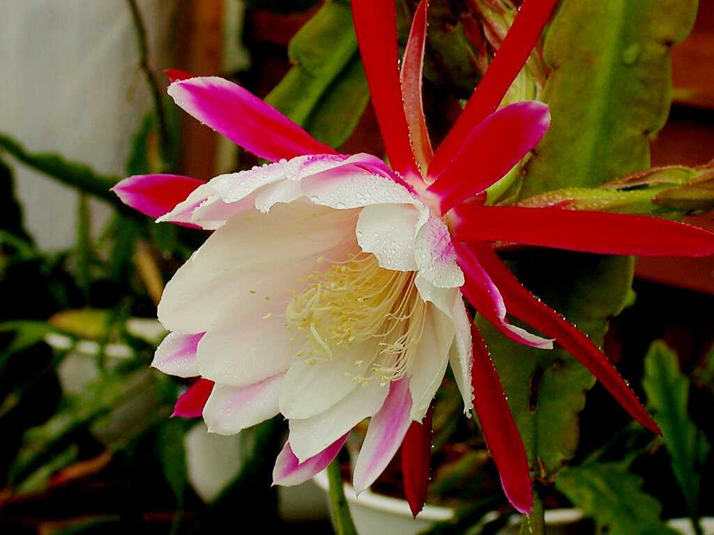 Не знаете, как выбрать кактус, начните коллекцию с данного вида. Листики полностью отсутствуют. На их месте образовываются широкие и плоские побеги. Отличается скоростью роста и сильным разветвлением. Молодые побеги смотрят вертикально вверх. Проходит время, и они станут поникшими. Цветки крупные, красивые, впервые появляются в трехлетнем возрасте. Могут достигать в длину до 30 см, в диаметре – до 15 см. Форма – воронковидная. Аромат достаточно приятный.