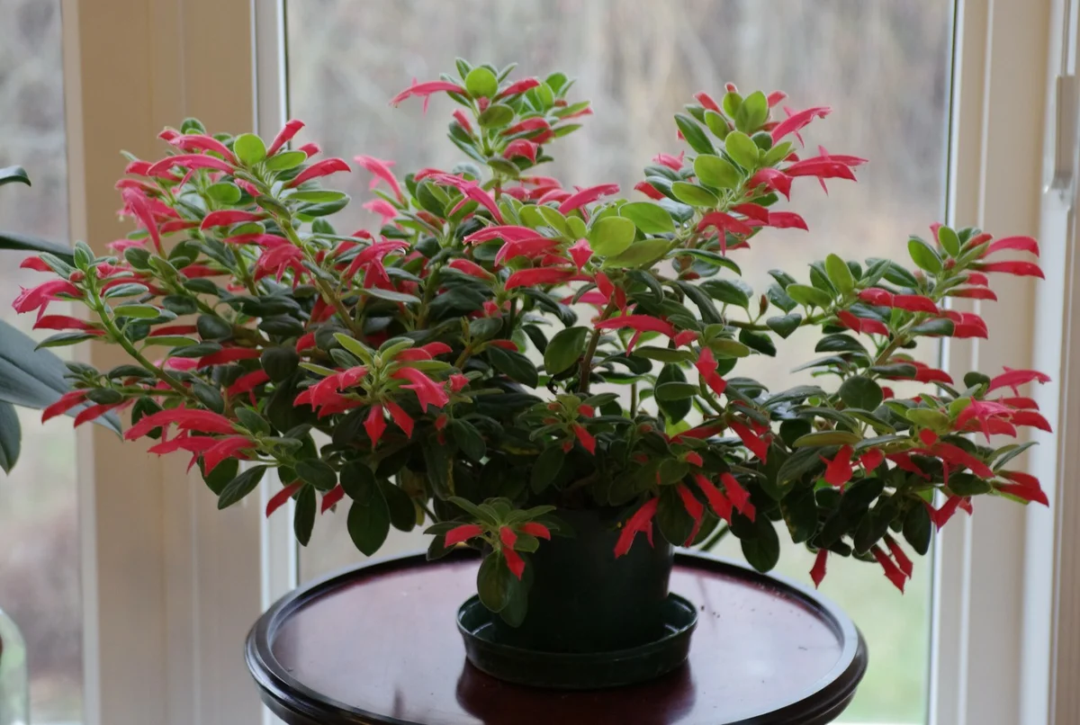 Листовые пластины крупные, а цветки алые, собраны в некрупные пазушные соцветия